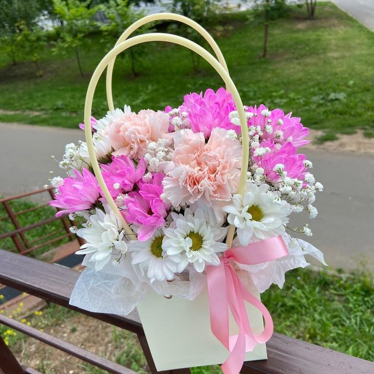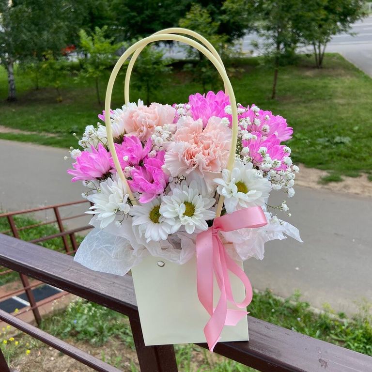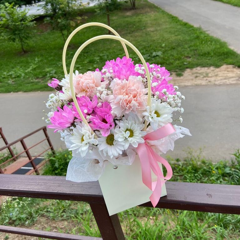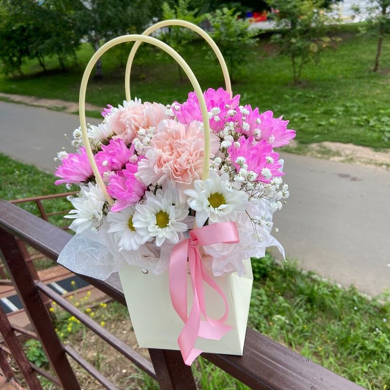 Добавить в избранное Убрать из избранного Сумочка с цветами 1320 Оформить заказ Составсумка с ручками - 1 шт.Оазис флористический - 1 шт.Лента атласная - 1 шт.Упаковка тишью - 1 шт.Диантус - 2 шт.Хризантема кустовая - 2 шт.Гипсофила - 1 шт. Составсумка с ручками - 1 шт.Оазис флористический - 1 шт.Лента атласная - 1 шт.Упаковка тишью - 1 шт.Диантус - 2 шт.Хризантема кустовая - 2 шт.Гипсофила - 1 шт.