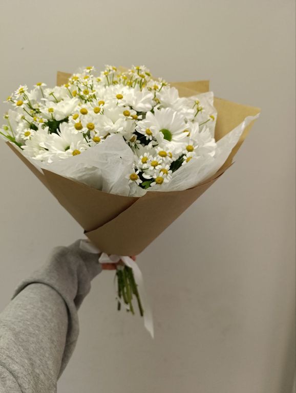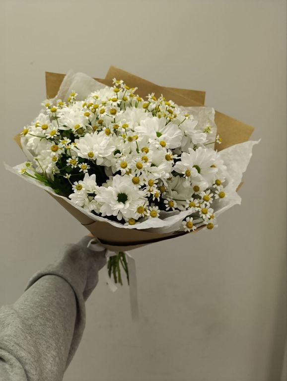 Нежная весенняя композиция “Ромашковое счастье” – воплощение легкости и природной красоты в каждом лепестке. Изысканное сочетание кустовых хризантем и ромашек создает воздушный, романтичный букет, наполненный солнечным настроением.