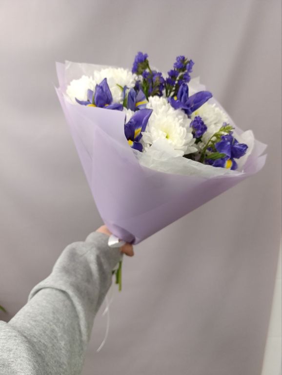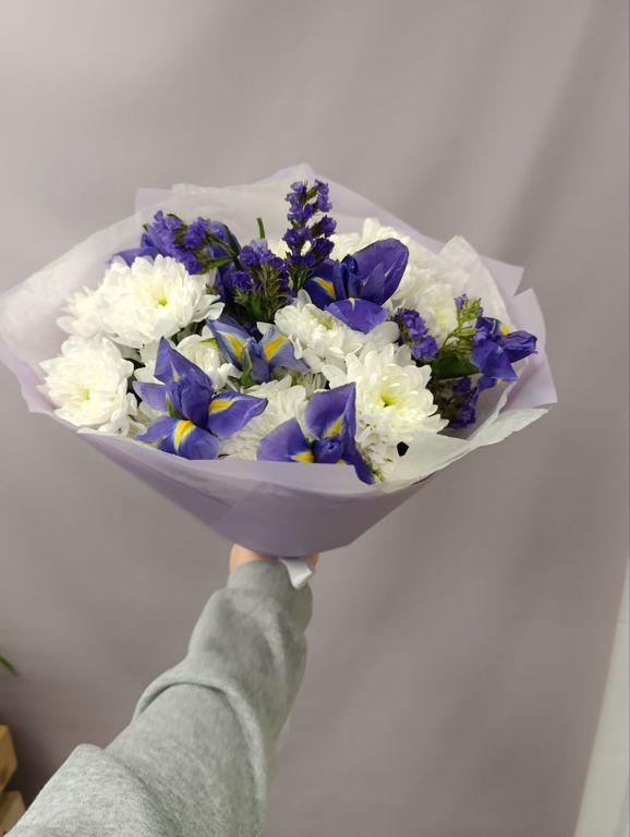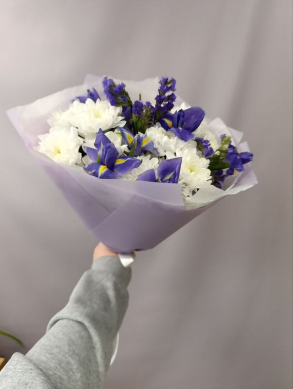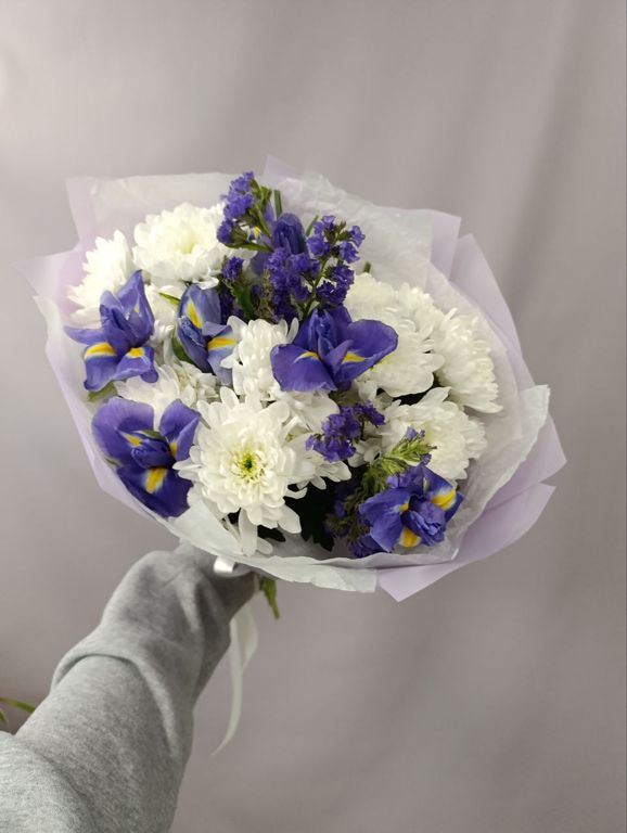 Букет из хризантем, ирисов и статицы — это нежное сочетание трёх прекрасных цветов. В этом букете вы найдёте пышные белые хризантемы, яркие синие ирисы и воздушные фиолетовые статицы. Такой букет станет прекрасным подарком на любой праздник и поднимет настроение своей красотой и свежестью.