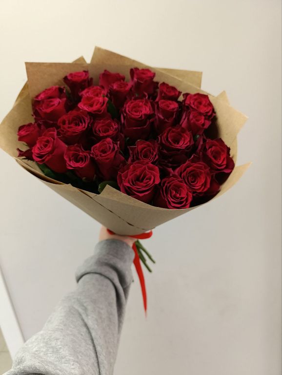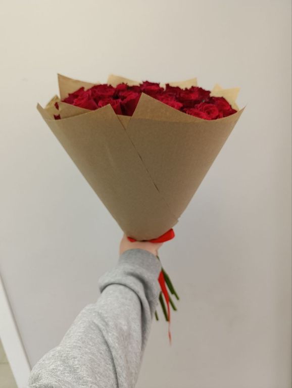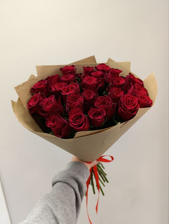 Красные розы символизируют любовь, страсть и преданность, а крафт упаковка придаёт букету изысканность и элегантность.
