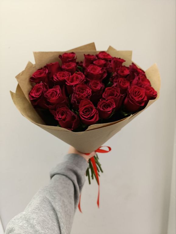 Букет из 25 красных эквадорских роз высотой 50 см в крафт упаковке — это великолепный подарок для ваших близких и друзей.
