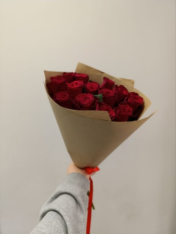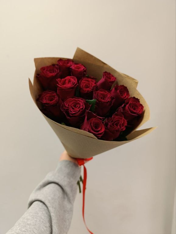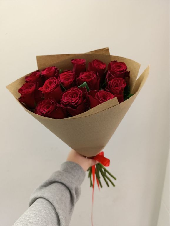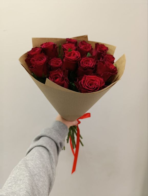 Букет из 13 красных роз высотой 50 см, упакованный в крафтовую бумагу, станет прекрасным подарком для любого случая.