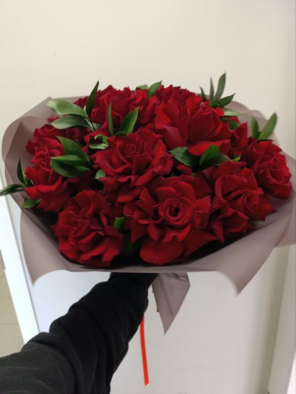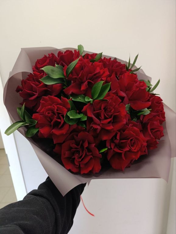 Пятнадцать красных французских роз из Эквадора, украшенных зеленью рускуса, представляют собой изысканный и элегантный букет.