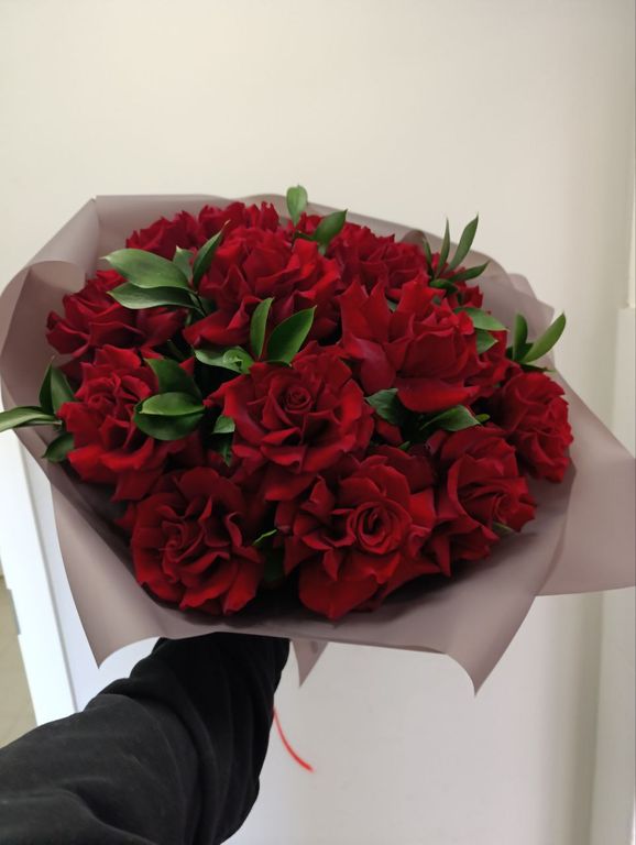 Букет упакован в стильную дизайнерскую упаковку, которая подчёркивает его роскошь и элегантность. Упаковка выполнена из высококачественных материалов и оформлена в соответствии с последними тенденциями флористического дизайна. Она надёжно защищает букет от повреждений и сохраняет его свежесть на долгое время.