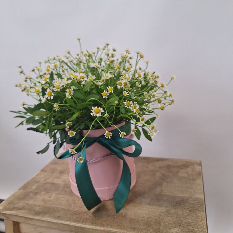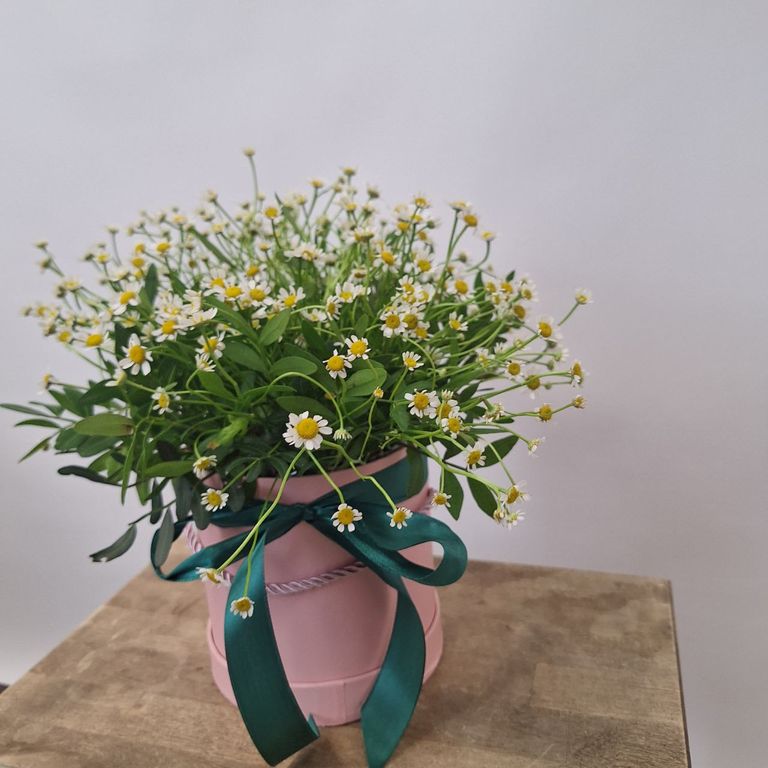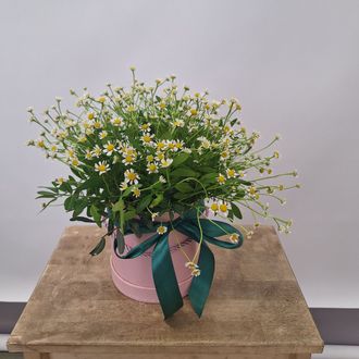 Композиция из кустовых ромашек в шляпной коробке — идеальный подарок для тех, кто ценит природу и простоту.