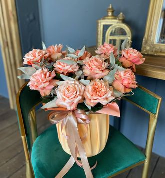 Композиция из французских роз и эвкалипта в шляпной коробке — идеальный подарок для ваших близких. В ней 11 свежих розовых и белых роз, дополненных ароматными листьями эвкалипта. Эта изысканная и стильная композиция станет прекрасным украшением любого интерьера и подарит радость и счастье вашим любимым людям.