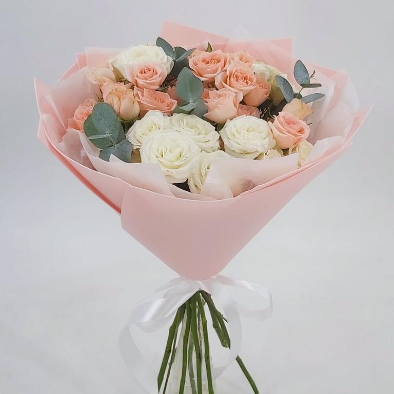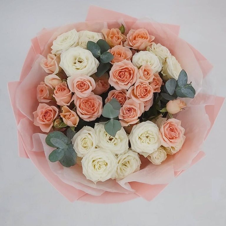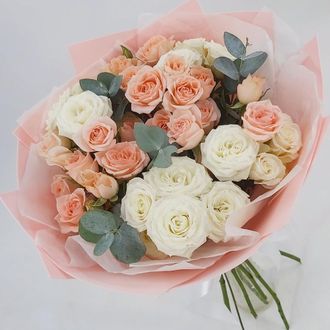 Нежнейшие кустовые розочки с веточками эвкалипта в стильном оформлении в тон. Такой букет всегда уместен и подойдёт для любого повода: День Рождения, именины, годовщина свадьбы, рождение ребенка, 8 марта, День Святого Валентина, выпускной и т.д. Можно вручить маме, сестре, подруге, коллеге, учителю, любимой.